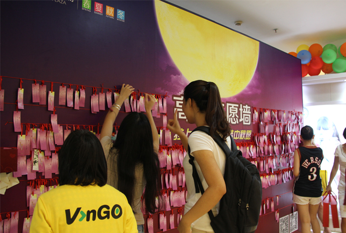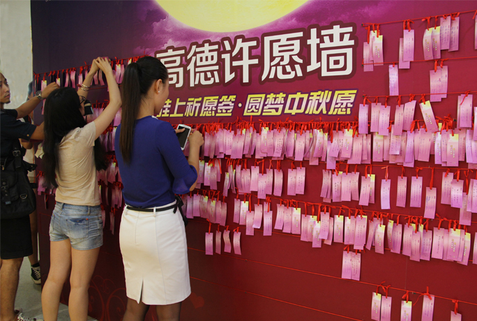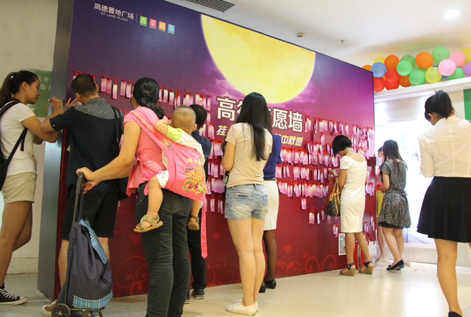 中秋节盛行于宋朝,至明清时已与元旦齐名,成为我国的主要传统节日之一。古代中秋节猜灯谜活动千百年来经典传承。今年中秋节也不例外,在高德置地广场同样可以参加高德中秋灯谜会活动。另外商场还特别设置了温馨浪漫的许愿墙,为消费者提供免费许愿的场地,许愿墙的功能不仅可以许愿,还可以通过它与朋友们互动,相互送出祝福。据了解,高德许愿墙活动从8月30日开始,消费者在许愿墙旁找到祈愿签和祈愿笔后,就可以写中秋祝福或者愿望挂在许愿墙上,商场每天将准备1000个免费许愿的名额;与此同时,9月8日(含当天)前加高德置地广场官方微信,并发送与许愿墙的合照,即有机会获得高德置地广场送出的温馨礼物中秋灯笼。高德中秋灯谜会活动将集中在9月8日中秋节当天下午,在活动现场猜中一个灯谜加任意金额购物小票,即有机会获得精致的中秋礼物。