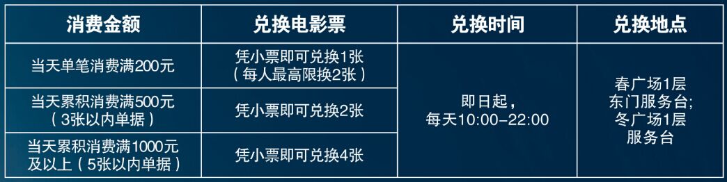 2. 消费者可兑换活动期间任意场次电影票,先到先得,换完即止(座位随机分配);